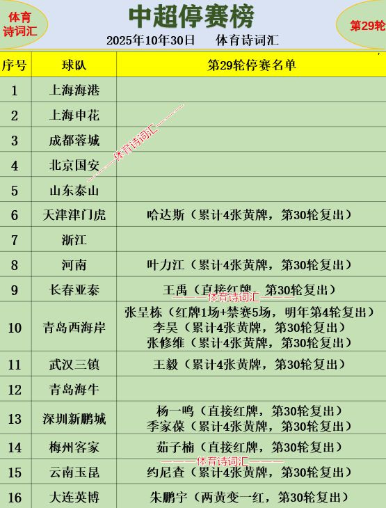 中超第28轮已经结束,联赛只剩最后两轮,争冠与保级都没有决出名次,上轮前三不胜使得争冠形势不变,而海牛与深圳的取胜则将保级形势变得更加有悬念。第29轮即将在本周开赛,在第28轮停赛的蒋圣龙、孙捷、赵宏略、兰克尔泽、叶楚贵、曹海清等人迎来复出。