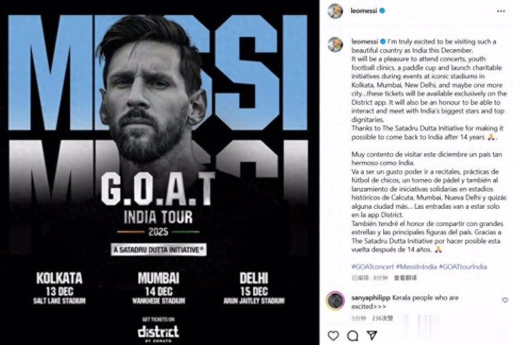 梅西社媒激动写道:我非常兴奋能在今年12月访问印度这样一个美丽的国家。我很高兴能够参加音乐会、青少年足球训练营、桨网球杯赛,并在加尔各答、孟买、新德里以及可能还有另一座城市的标志性体育场举办慈善活动。